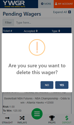 Clicking the delete option next to the wager will produce a pop up asking you to confirm the wager deletion. Once confirmed the wager will be deleted.